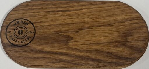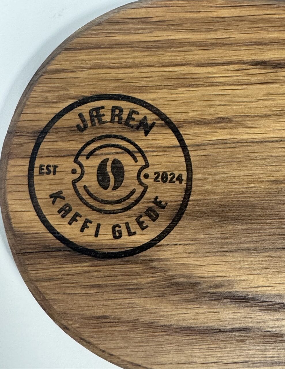 Flott serveringsfat i tre med Jæren Kaffi Glede logo.